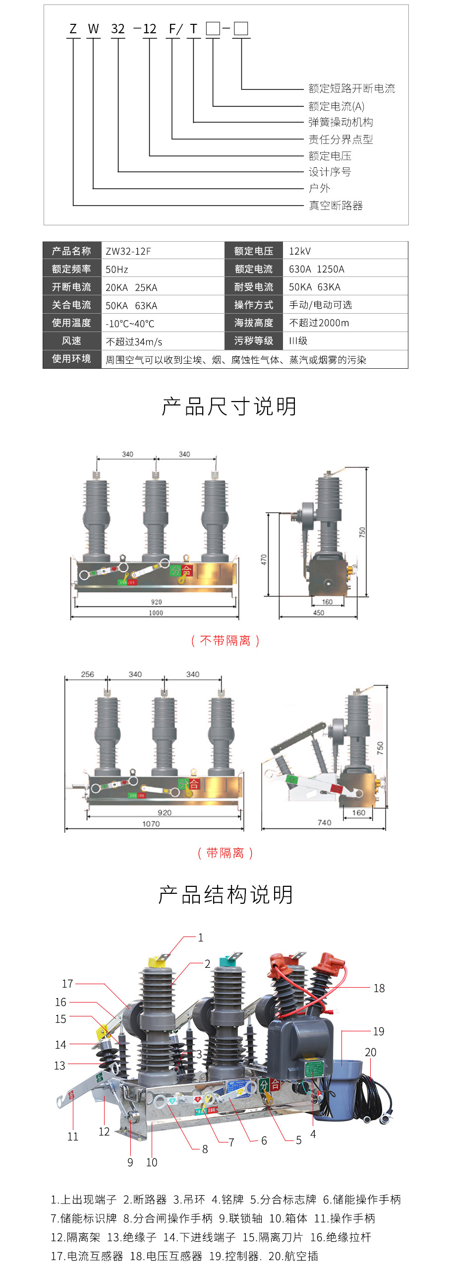 ZW32-12F柱上高壓智能分界真空斷路器(俗稱看門狗),重要用來開斷關(guān)合農(nóng)網(wǎng)、城網(wǎng)和小型電力體系的負荷電流,過載電流、短路電流。該產(chǎn)物總體布局為三相極柱式,三相真空滅弧室置于固封極柱內(nèi),利用絕緣質(zhì)料相間絕緣及對地絕緣,性能可靠,絕緣強度高。重合器型智能斷路器。根本型與重合控制器配符實用于易取電源的場合,PT型與重合控制器配符實用于無電源的場合,智能斷路器實用于輻射型供電及環(huán)網(wǎng)供電體系,資助體系消除瞬時妨礙,主動規(guī)復(fù)供電,也可斷絕永世妨礙,實現(xiàn)配網(wǎng)主動化。智能斷路用具備1~3次重合閘成果,且重合器參數(shù)可以整定;智能斷路用具備合閘涌流控制、過流掩護和短路速斷三段復(fù)合掩護的成果,且參數(shù)可以連續(xù)整定;智能斷路用具備小電流接地掩護成果,且參數(shù)可以連續(xù)整定;智能斷路器既可以實現(xiàn)有線遠方控制,也可在桿下無線遙控。用于交換50Hz,電壓10~12kV的三相電力體系,作為分斷,關(guān)合負荷電流之用,它具有過載及短路掩護成果,速斷掩護成果,定時限延時掩護成果,主動重合閘成果,還可根據(jù)用戶必要配裝避雷器或斷絕開關(guān)(即斷路器與斷絕開關(guān)組合,以下簡稱"組合智能型斷路器")等.該智能型斷路器自備電源,可就近遙控操縱,備有CT,PT接口,可滿意遙測要求. 斷路器有滅弧裝置,故斷路器可以或許帶負荷操縱,不但能操縱負荷電流,還能操縱妨礙(短路)電流;斷路器有精良的封裝情勢,故單純觀察斷路器,不能直觀地確定其是處在閉合或斷開位置。
