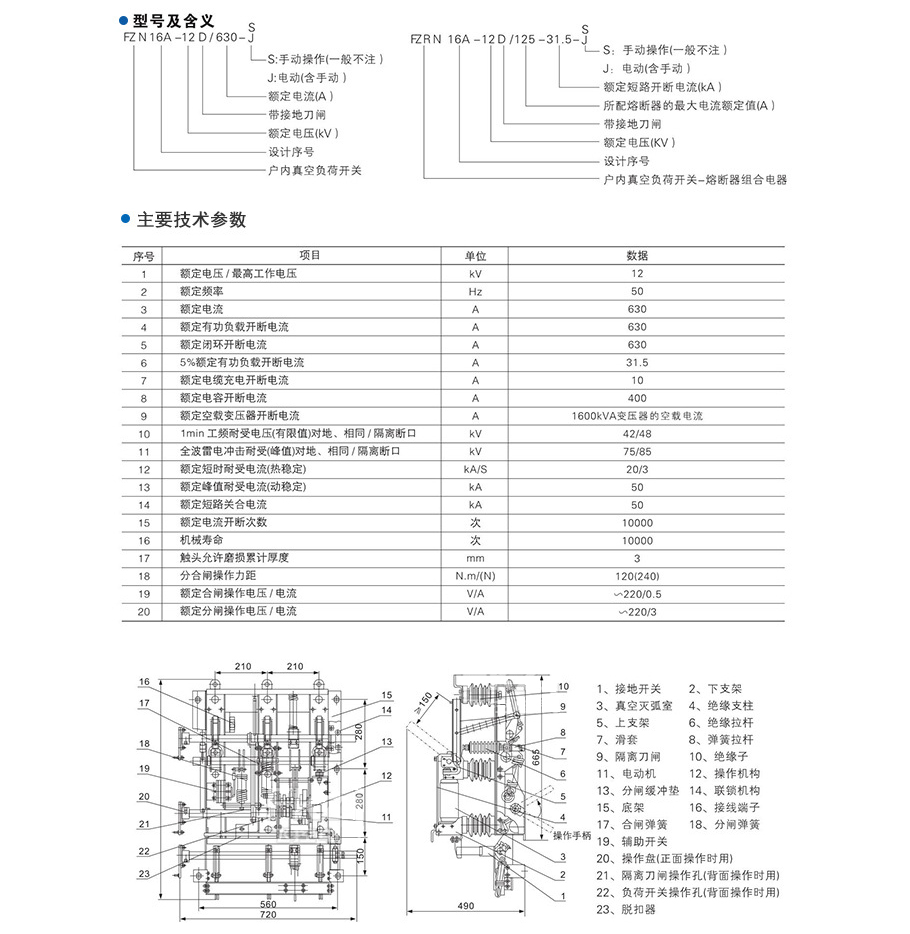 FZN16A- 12D/630型負(fù)荷開關(guān)和FZN16A- 12RD/200- 31.5型組合電器適用于交流50Hz,額定電壓6~ 10kV的網(wǎng)絡(luò)中。FZN16A- 12D/630可開斷負(fù)荷電流,FZN16A- 12RD/200-31.5可開斷負(fù)荷電流、過載電流和短路電流,特別適用于無油化、不檢修及頻繁操作要求的場所。本產(chǎn)品可配用CS6 - 1型操作機(jī)構(gòu),也可在開關(guān)上直接操作,不必另附操作機(jī)構(gòu)。選用FZN16A- 12 -J型開關(guān)可同時實(shí)現(xiàn)電動和手動操作。