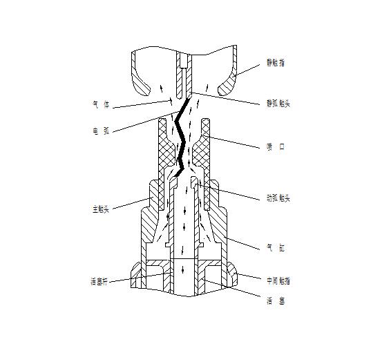 3.1斷路器采用六氟化硫(SF6)氣體作為滅弧介質(zhì),六氟化硫氣體不但有良好的滅弧性能,而且電氣絕緣性能非常好,氣體在開斷時(shí)被壓氣筒壓縮后噴向電弧并將電弧熄滅,開斷的簡(jiǎn)單原理如圖1。該斷路器具有結(jié)構(gòu)簡(jiǎn)單、開斷性能良好,并且操作平衡等許多優(yōu)點(diǎn)。它還是一種理想的切合電容器組及電抗器組的開關(guān)。