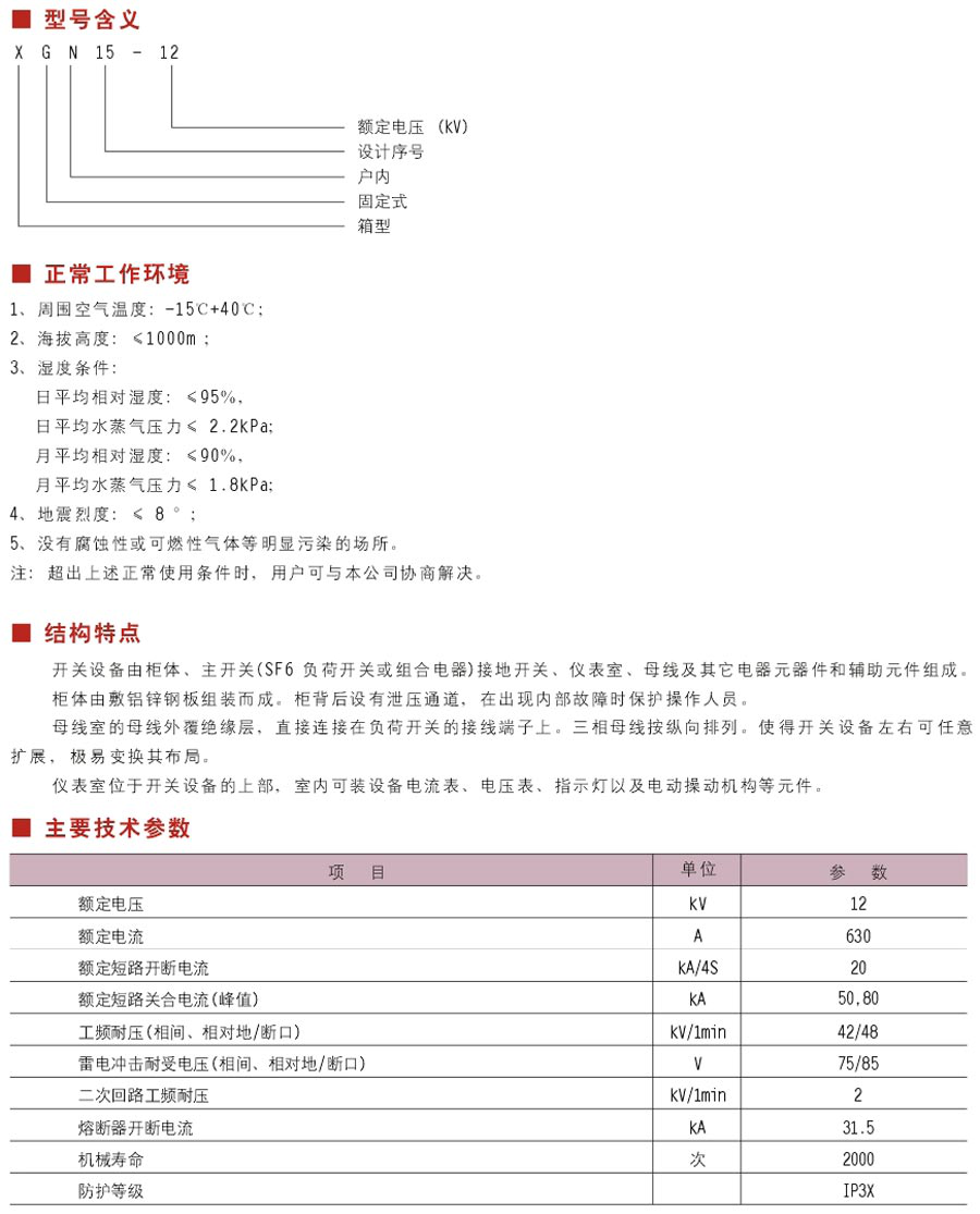 XGN15-12箱型固定式戶內(nèi)交流金屬封閉開關設備(簡稱“開關設備”),用于額定電壓為12KV、額定電流630A及以下和環(huán)網(wǎng)供電或輻射型供電系統(tǒng)中,尤其適合裝入預裝式變電站作為電力系統(tǒng)的控制和保護。